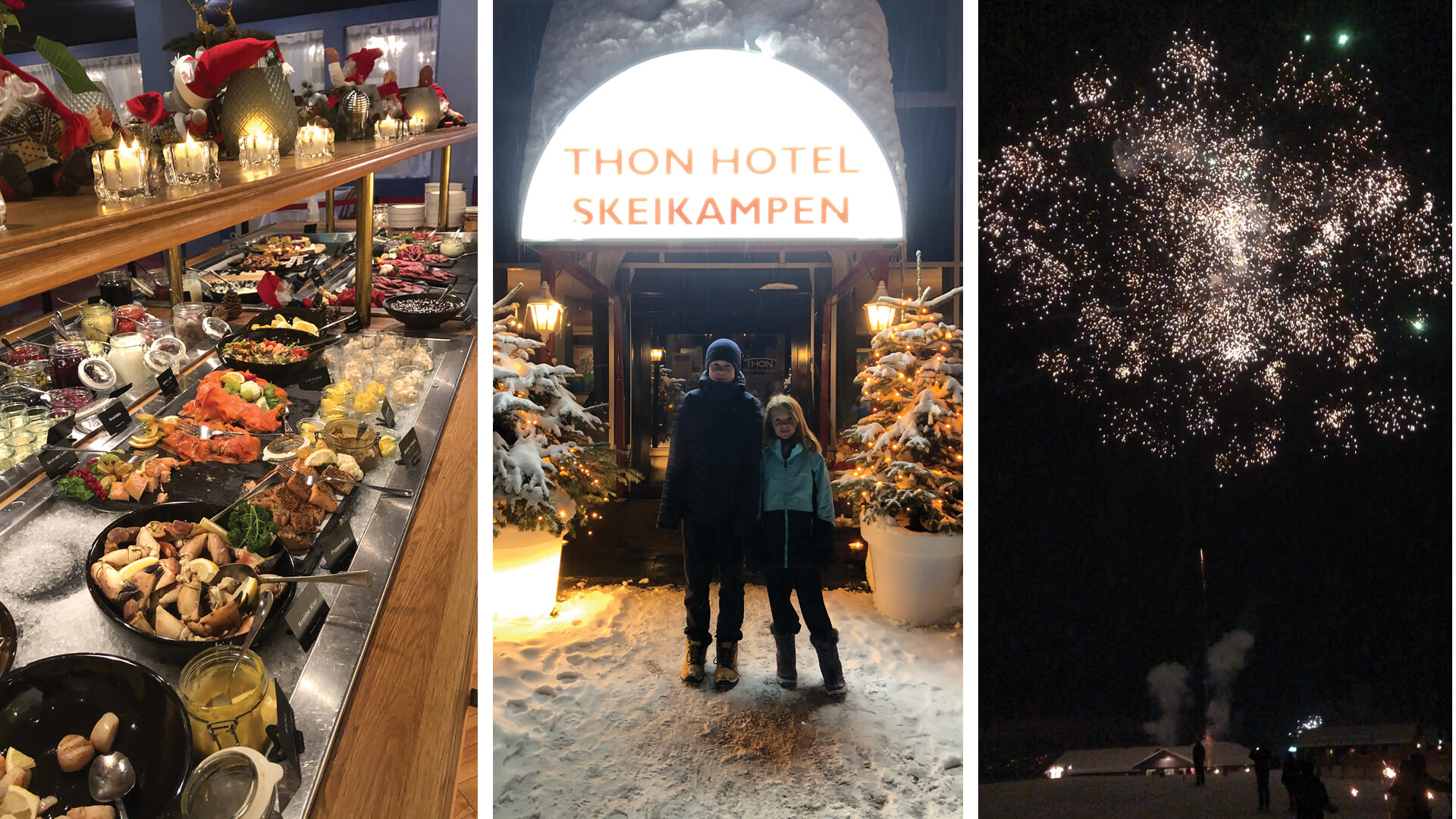 Ved midnatt fikk vi oppleve et fantastisk fyrverkeri rett utenfor leiligheten. Vi sto i trygge omgivelser og så på rakettene som ble sent opp nederst i alpinanlegget.